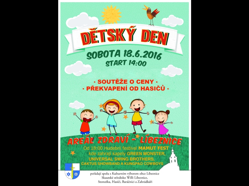 Datum konání 18.6.2016 - 14:53 Typ pozvánky obecná Tradiční líbeznický Dětský den se uskuteční v sobotu 18. června od 14 hodin. Pro děti budou připravené nejrůznější hry, spousta cen a také překvapení od hasičů. Fotogalerie