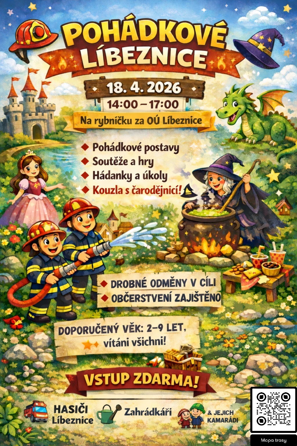 Hasiči a Zahrádkáři Líbeznice pořádají akci pro děti Pohádkové Líbeznice, a to v sobotu 18. dubna 2026 od 14 hodin v lokalitě Na Rybníčku.
