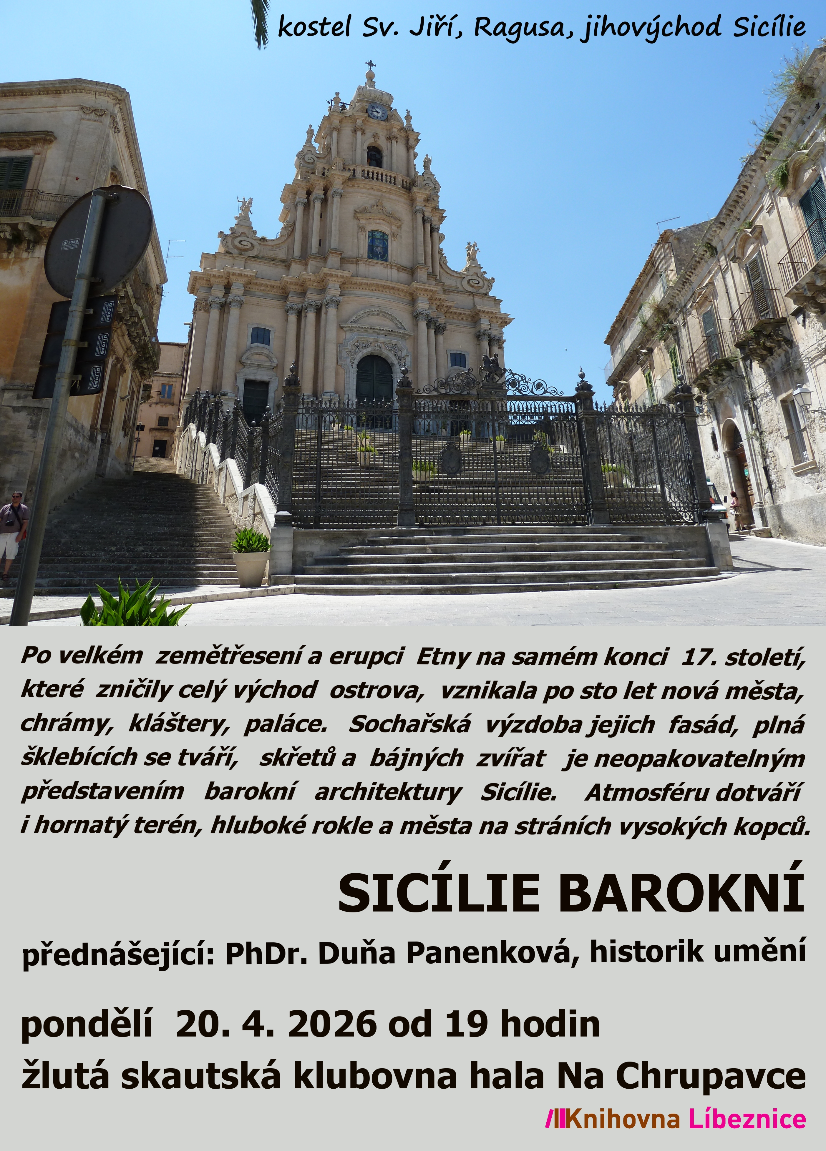 Knihovna Líbeznice vás srdečně zve na poutavou přednášku o Sicílii, která se koná v pondělí 20. dubna 2026 od 19 hodin ve žluté skautské klubovně v hale Na Chrupavce.