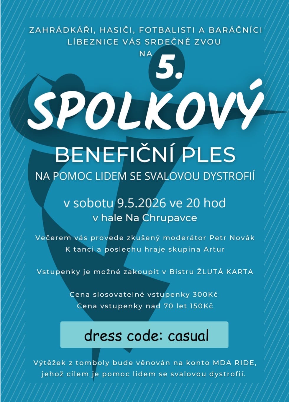 Líbeznické spolky vás srdečně zvou na 5. Spolkový benefiční ples na pomoc lidem se svalovou dystrofií. Koná se v sobotu 9.5.2026 od 20 hodin v hale Na Chrupavce. K tanci a poslechu zahraje skupina Artur. Vstupenky v Bistru Žlutá karta za 300 Kč, pro osoby nad 70 let 150 Kč. Přijďte si užít skvělý večer, zatančit si a podpořit dobrou věc.