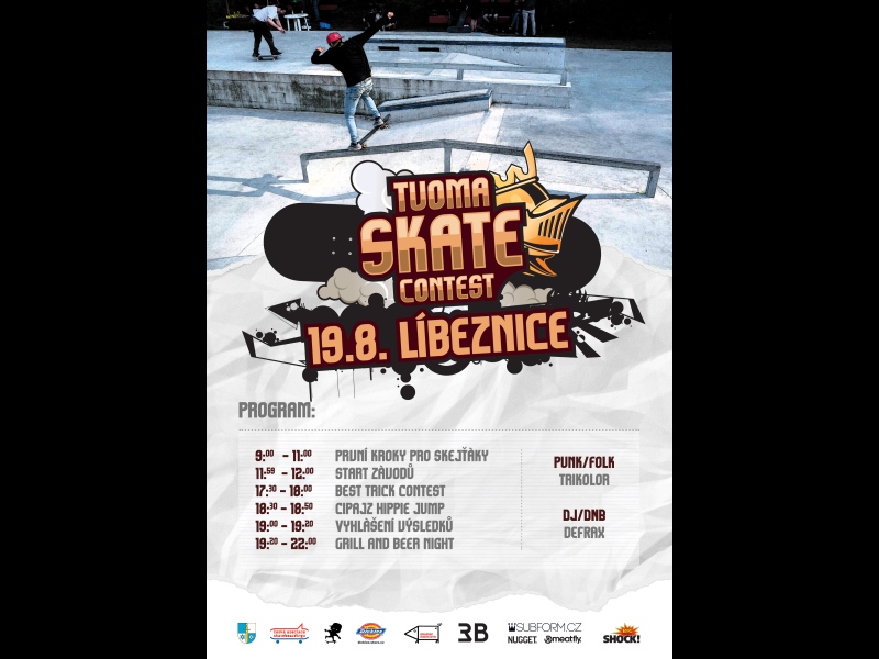 Srdečně Vás zveme v sobotu 19. srpna 2017 do Areálu zdraví v Líbeznicích na historicky první ročník skateboardového závodu s názvem Tuoma Skate Contest. Lokální skateboardový závod se bude dělit na dvě kategorie: do 15 let a 15+. Připraven je doprovodný program s názvem „První kroky pro skejťáky“. Po dobu akce bude hrát DJ Defrax, můžete se těšit na BESTtrick soutěž o nejlepší trik ve skateparku a Cipajsz Hipie Jump (skok přes laťku). Občerstvení zajištěno v kavárně. Přihlásit se můžete na facebookových stránkách Tuoma Skate Contest nebo na místě.