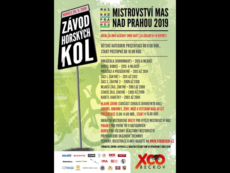 Zveme Vás na Závod horských kol - Mistrovství MAS Nad Prahou 2019, který proběhne v neděli 26.května v areálu za obcí Klíčany směr Bašť (za sklady K+B Expert). Dětské kategorie prezentace od 8 hodin, start postupně od 10 hodin. termíny, registrace a info najdete na www.xcobeckov.cz.