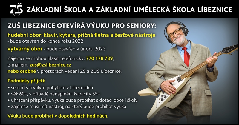 ZŠ a ZUŠ Líbeznice otevírá výuku pro seniory v hudebním oboru a ve výtvarném oboru. Zájemci se mohou hlásit telefonicky 770 178 739, e-mailem: zus@zslibeznice.cz nebo osobně v prostorách vedení ZŠ a ZUŠ Líbeznice. Podmínky přijetí: