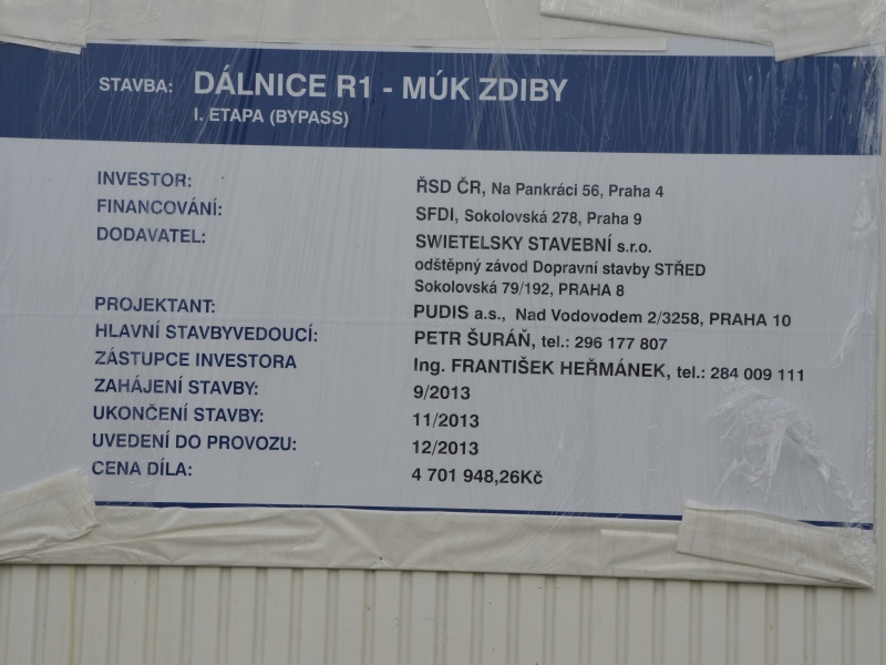 Společnost Swietelsky dokončila bypass kruhové křižovatky MUK Zdiby. Zbývá už jen zajistit příslušná povolení pro uvedení do provozu. V pondělí 9. prosince 2013 odpoledne by se tak na bypassu mohla objevit první auta. Stavba za 4 702 tis. Kč by měla přispět k lepší průchodnosti křižovatky. Přilehlé obce, projektanti i ŘSD si od dokončeného rozšíření slibují, že se alespoň o něco zkrátí kolony v ranních a odpoledních hodinách.