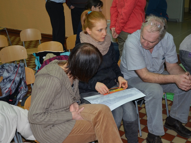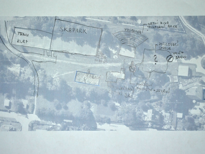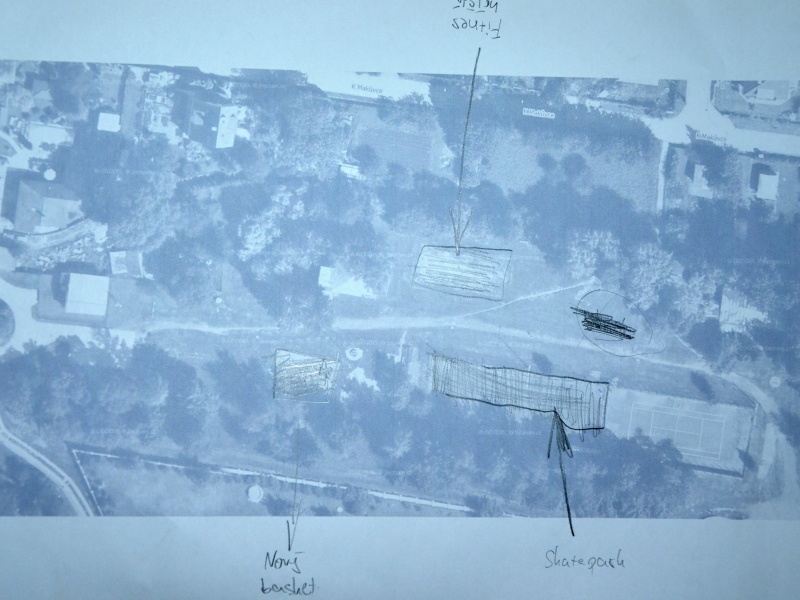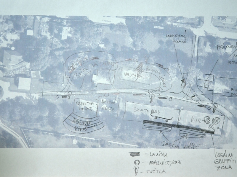 Další část programu večera potom tvořily ukázky nejrůznějších skateparků v Čechách i v zahraničí a také příklady povedených venkovních fitcenter či work outových hřišť. To všechno měla být inspirace pro samotnou práci ve skupinkách. Každá z nich si vzala jednoduchou ortofotomapu areálu zdraví a začala do ní kreslit své plány. Na závěr pak každá skupinka své dílo před ostatními komentovala.