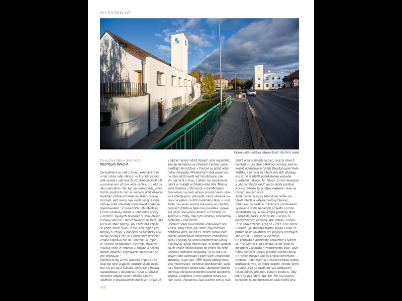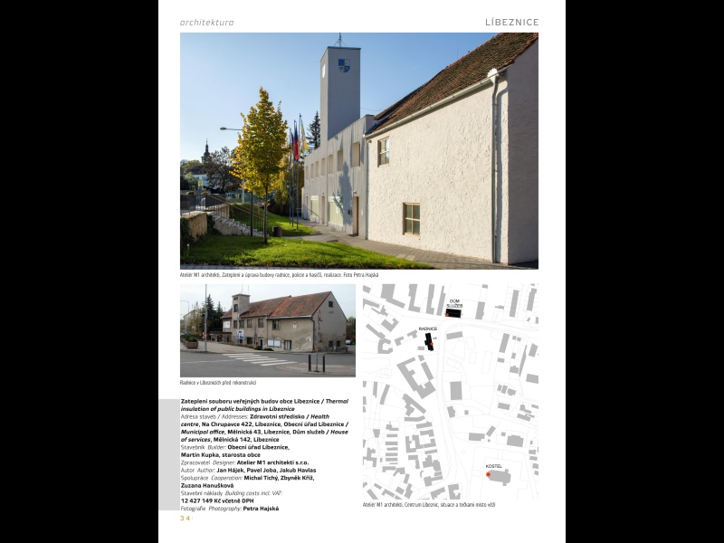 S Divadlem kouzel sousedí budovy obecního úřadu a domu služeb, které spolu vytvářejí severozápadní kout ústředního prostoru obce a účinkují v ní jako profánní protějšek sakrálního okrsku kolem kostela na druhé straně líbeznického centra. Právě díky těmto budovám a jejich důmyslné úpravě na sebe Líbeznice poprvé upoutaly pozornost architektonických kritiků, jmenovitě Adama Gebriana a jeho stati „Pozvolná proměna“ v časopisu Respekt.10 Dotaci na zateplení využil ateliér M111 u těchto budov způsobem, jaký oba domy ještě více nezdevastoval, nýbrž povýšil na skutečnou architekturu. O výchozím vzhledu obou objektů a o výsledku jejich metamorfózy, která proběhla v roce 2014, dostatečně promlouvají fotografie, proto se zde zdržím popisu. Kromě pečlivě zpracovaných povrchů obou těchto domů a pěkných proporcí jejich okenních otvorů si tu přesto zaslouží pozornost motiv věží: u obecního úřadu věže skutečné, u domu služeb falešné, vzniklé navýšením atiky na rohu budovy a opatřené pak hodinami. Do trojice doplňuje tyto tradiční symboly občanské samosprávy věž pozdně barokního kostela. Učitelka architekta z M1 Jana Hájka Alena Šrámková používá ve svých projektech věže podobným neskrývaně symbolickým způsobem a z proměny obou líbeznických objektů lze její vliv vyčíst.