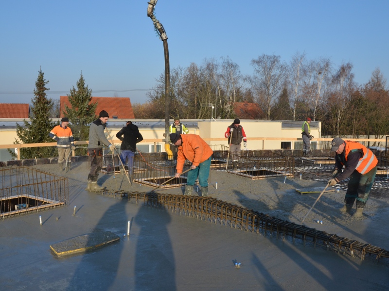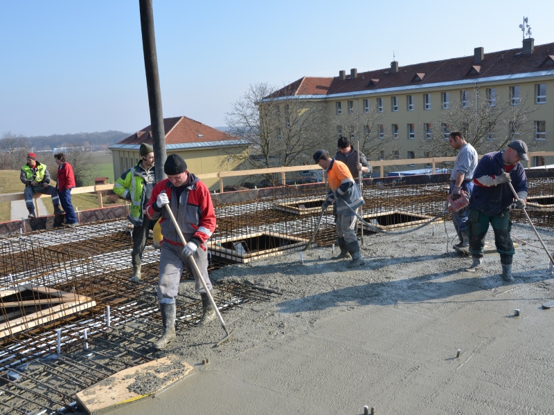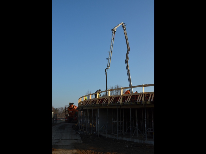 Více než 270 m3 betonu přivezlo na stavbu v průběhu dne přes třicet mixů. Na střechu objektu beton čerpala pumpa o rozpětí ramene více než 40 m.