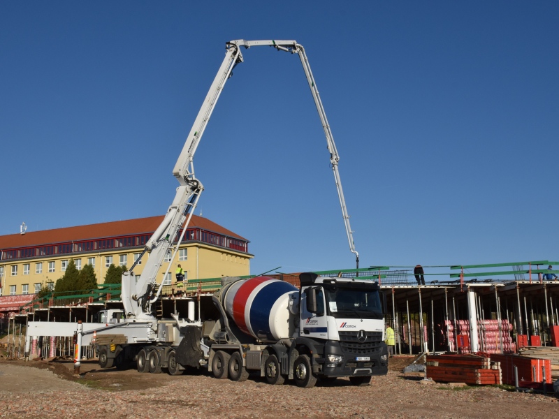 Stavba nové budovy školy pokračuje rychlým tempem. Dva měsíce po zahájení prací je hotová první čtvrtina stropní desky. Chystá se betonování opěrné zdi u paty hlavní budovy školy. Kompletní monolitická část stavby musí být dokončená do poloviny prosince.Harmonogram prací na stavbě školy má jasný cíl v podobě otevření prvních 12 tříd v září příštího roku. Od zahájení stavby se tak velmi pečlivě sleduje i postup prací. K žádnému zdržení zatím nedošlo. Dokončené jsou všechny základové pasy s výjimkou založení hlavní opěrné zdi u paty staré budovy školy. Dokončují se poslední pilíře na základových pilotách. Kvůli prostorovému vyztužení stavby doplňují opěrný systém také čtyři nosné zdi v prostoru hlavního vchodu do budovy. V dalších dnech se kromě přípravy dalších částí stropní desky pro betonování bude pracovat na přípojkách a na hlavní opěrné zdi. Každý říjnový týden by měla přibýt jedna čtvrtina stropu.
