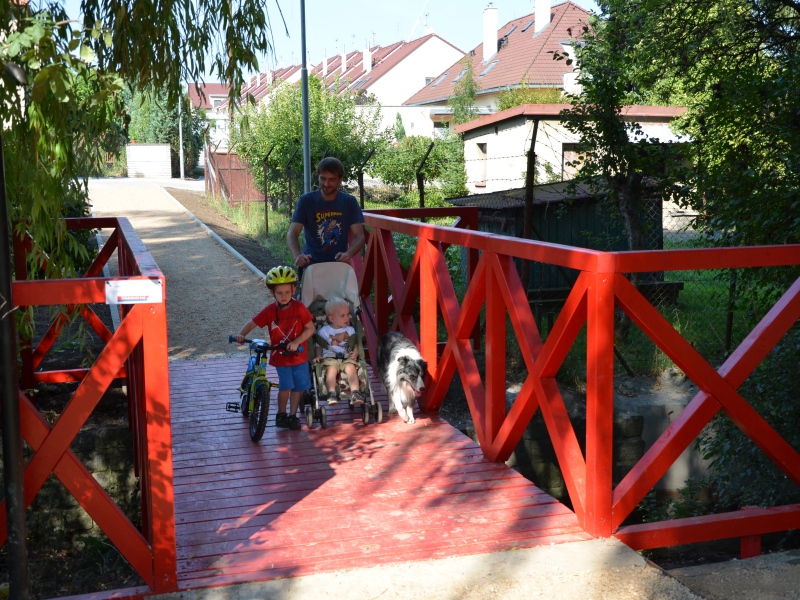 Červená na cestách většinou znamená STOP, ne tak ale na cestě od školy do budoucí tělocvičny Chrupavka. Nový celodřevěný červený můstek naopak láká k cestě přes potok. Na obě strany od můstku vedou krásné mlatové cesty a pro větší bezpečnost procházejících byla upravena i křižovatka ulic K Makůvce a Pod Školou. Zvýšené místo pro přecházení i nový chodník je upraven i pro osoby se sníženou schopností pohybu a orientace; vodící pásy jsou pro změnu červené.