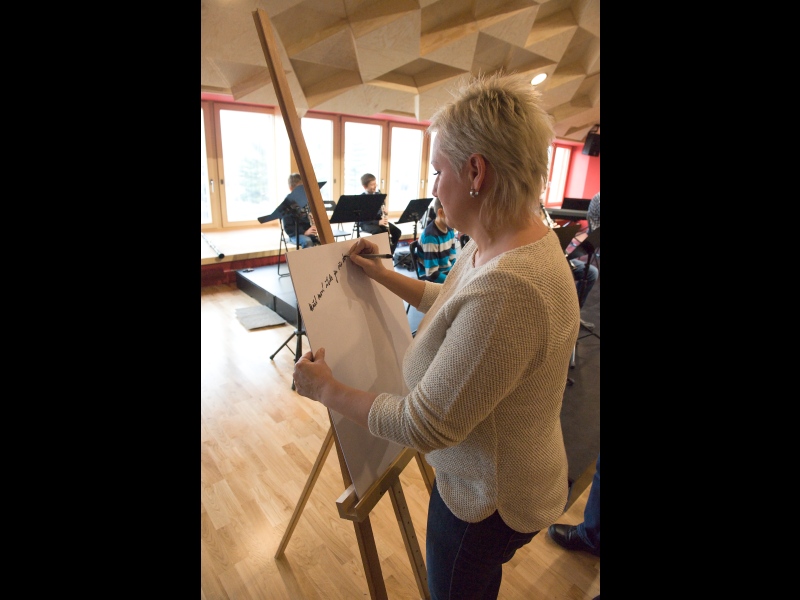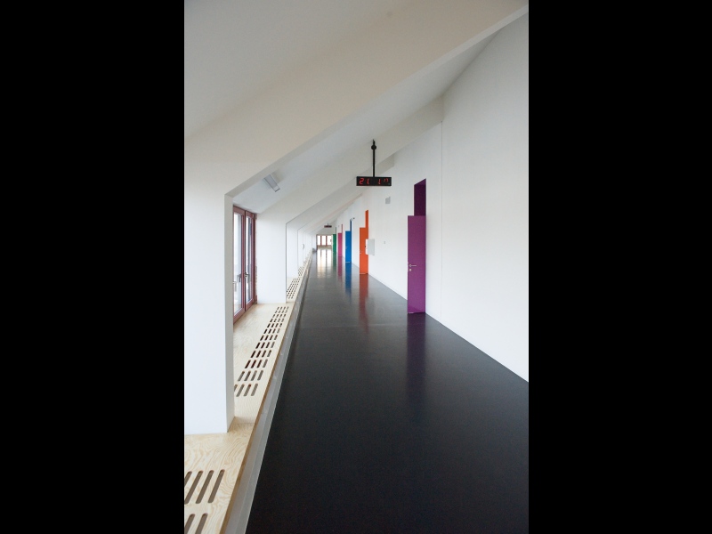 I v tomto případě vsadilo vedení obce na návrh řešení od architekta. Stavbě předcházela samozřejmě i diskuse s pedagogy o tom, jak by mohlo uspořádání nového prostoru vypadat. Nejvážnější omezení ale představovaly požární předpisy a normy. „Postupně jsme vyloučili hned několik variant, které přísné normy nesplnily a hledali jsme cenově dostupné řešení. Vypomoci jsme si nakonec požárním můstkem do budovy s učebnami ZUŠ. Tím se podařilo vyřešit problém únikových cest. Celé projektování se ale ze všeho nejvíc podobalo tanci mezi kapkami deště. Snažili jsme se ale především vytvořit zajímavé a pěkné prostředí pro žáky. Každá třída má svou barvu. Z každé je také krásný výhled na obec a z chodby pak na Duhovku. Všechno by se tu mělo spojit v jeden smysluplný celek. Znovu jsme využili konstrukci z lepených dřevěných vazníků. Jen díky tomu nemusí mít celý prostor vlastně žádný sloup. Velkou péči jsme věnovali koncertnímu sálu a aule. Měli jsme za úkol zajistit dobrou akustiky sálu. Vypomohli jsme si vlastně výtvarným dílem. Strop totiž tvoří kombinace různě vysokých trojúhelníkových ploch. Věřím, že i díky tomuto osobitému řešení, bude prostor pro všechny návštěvníky příjemný a lákavý,“ přibližuje celý projekt architekt Jan Hájek.