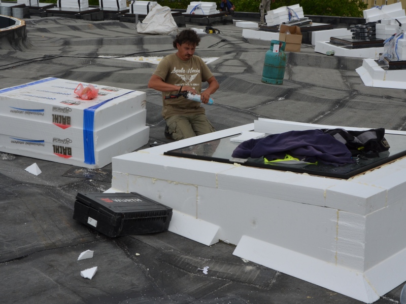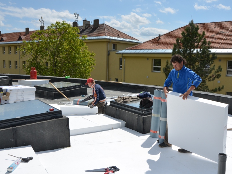 Zároveň v těchto dnech vrcholí práce na tepelné izolaci střechy. Z polystyrenových desek tvoří řemeslníci zároveň novou spádovou vrstvu střechy pro odtok vody. Na vrstvy modifikovaného asfaltového pásu přijde ochrana proti prosůtání kořenů, následně půdní substrát pro rostliny tvořící vegetační střechu. Zateplují se také všechny světlíky.