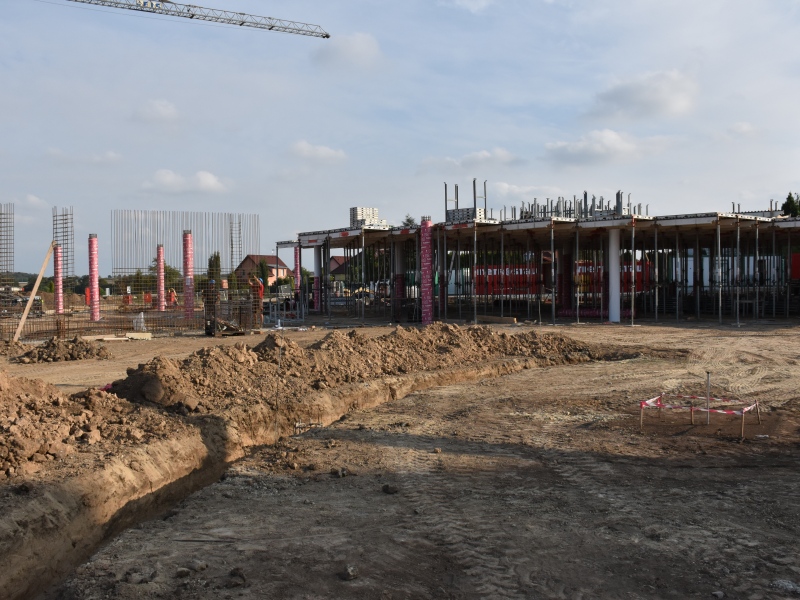 V dalších deseti dnech by měly být dokončeny všechny sloupy a vyšalovaná stropní deska. Zároveň začnou práce na armované výztuži stropní desky. Její první segmenty budou vybetonovány v prví polovině října. Souběžně začnou práce na přípojkách technických sítí. Při západní straně budoucího objektu vznikají záporové zdi.