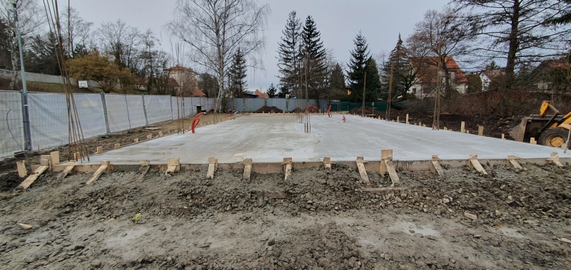 1.2.2023 Stavba zázemí pro Areál zdraví pokračuje podle harmonogramu. Včera proběhla betonáž základové desky.