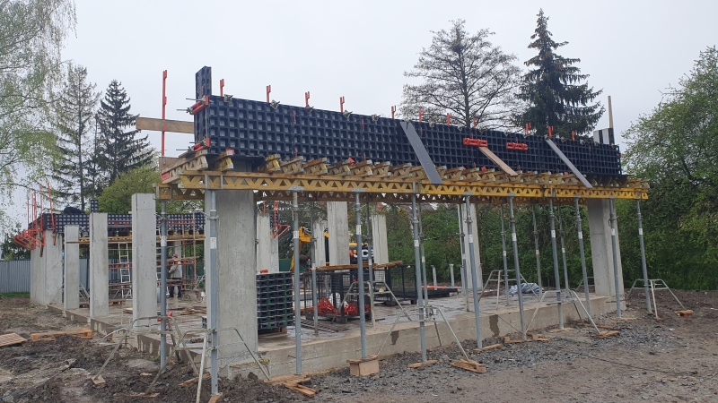 24.4.2023 Na stavbě zázemí v Areálu zdraví probíhá příprava na betonáž stropu zázemí a portálu podia, která proběhne v tomto týdnu.
