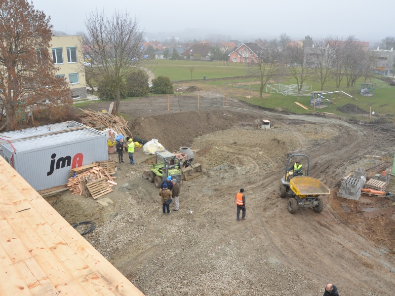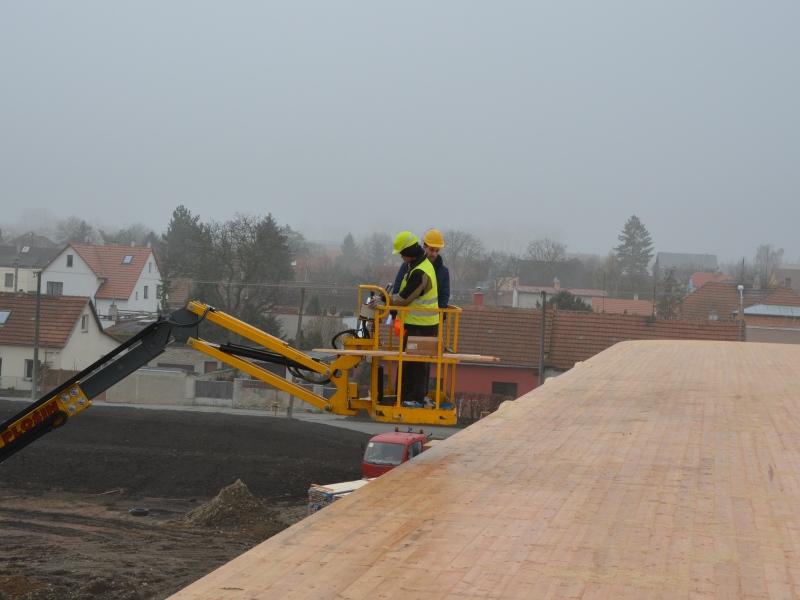 Aktuálně probíhá hydroizolace základové desky. Na nopovou fólii, která zajistí trvalé odvětrání základového souvrství, přibyde v nejbližších dnech sedmicentimetrová vrstva betonové mazaniny.