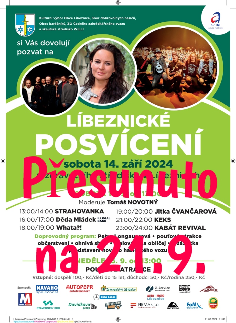 Chtěli bychom vás informovat, že z důvodu mimořádně nepříznivé předpovědi počasí na tuto sobotu jsme se rozhodli Líbeznické posvícení přesunout na další sobotu 21.9. 2024. Většina účinkujících potvrdila nový termín. Pouťové atrakce budou v provozu celý příští týden. Děkujeme za pochopení.