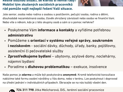 Chtěli bychom vás informovat, že MAS Nad Prahou zajišťuje mobilní sociální tým, který vám může pomoci při řešení nejrůznějších sociálních situací jako je pomoc při vyřízení sociálních dávek, zprostřed...
