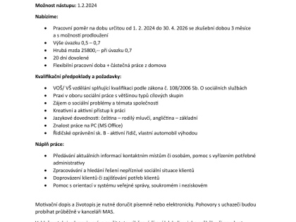 MAS Nad Prahou vyhlašuje výběrové řízení na pozici terénní sociální pracovník. Bližší podrobnosti naleznete v přiloženém souboru.