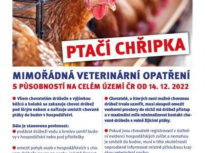 Státní veterinární správa (SVS) z důvodu přibývajících ohnisek vysoce patogenní ptačí chřipky v České republice vyhlašuje mimořádná veterinární opatření s celostátní působností. Všem chovatelům drůbež...