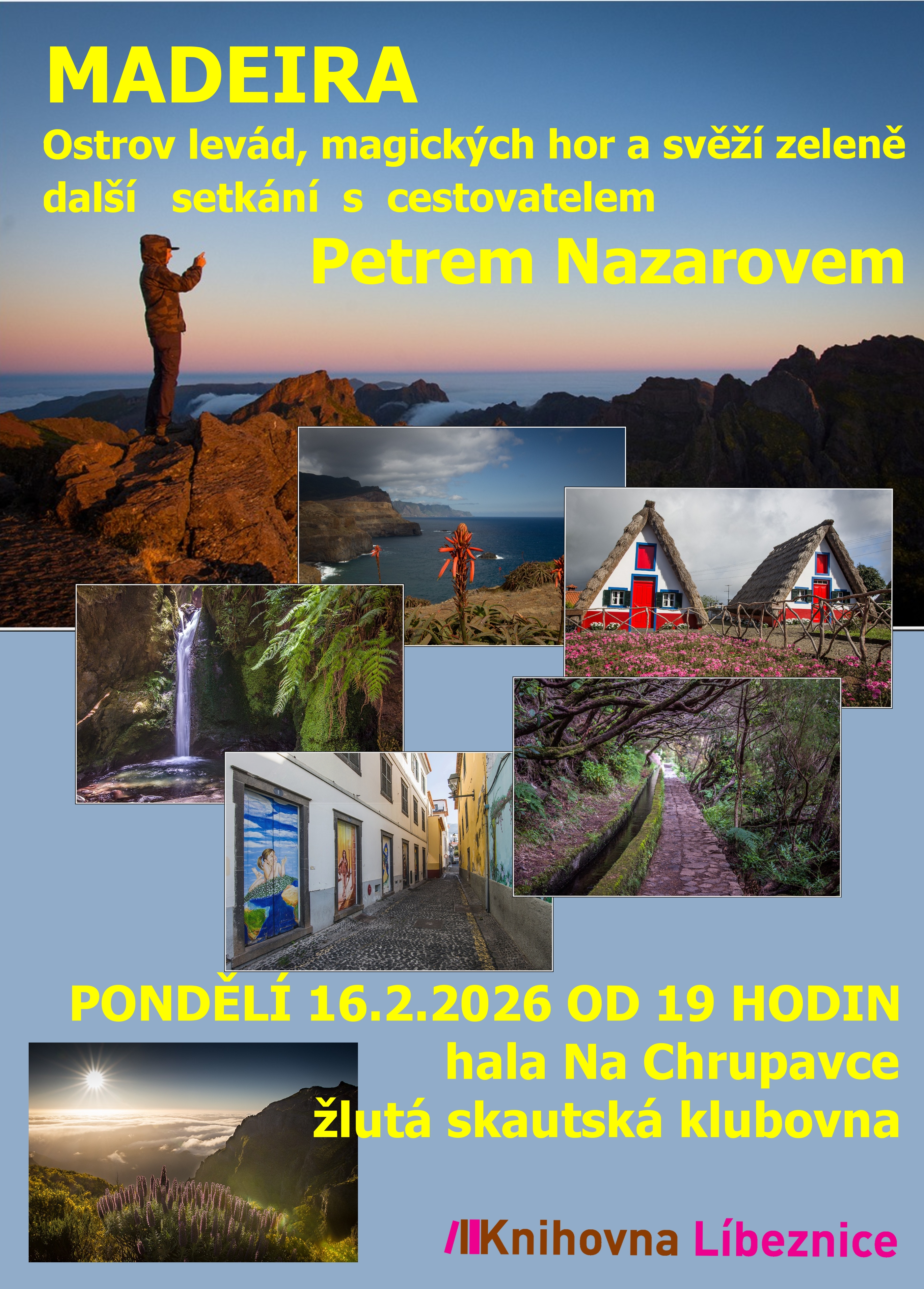 Obecní knihovna Líbeznice vás srdečně zve na setkání s cestovatelem Petrem Nazarovem, jehož tématem bude ostrov Madeira. Akce se koná v hale Na Chrupavce-skautské klubovně dne 16.2.2026 od 19.00 hodin.