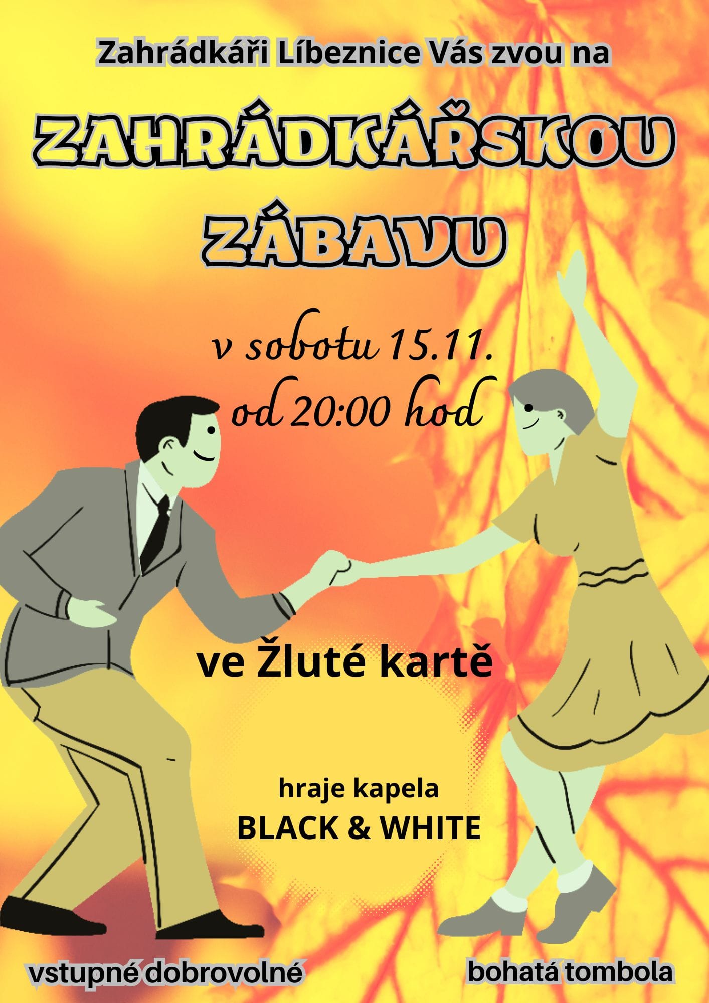 Zahrádkáři Líbeznice vás srdečně zvou na Zahrádkářskou zábavu, která se koná dne 15.11. 2025 od 20.00 v bistru Žlutá karta. Vstupné dobrovolné. Podrobnosti najdete v příloze.